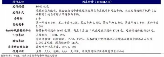 闻泰科技86亿元可转债将于28日发行,简称“闻泰转债”,评级AA+。如果根据最新收盘价测算,目前最新的转股价值在97.67元,溢价率不足3%,较为接近面值。兴业证券测算,参考纯债价值在90元附近。