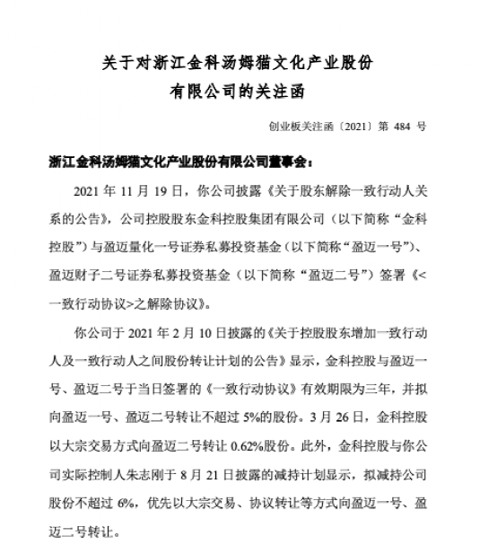 11月22日收盘,汤姆猫收涨6.22%,报4.78元/股。当日晚间,深交所下发关注函,要求其说明控股股东股权转让的目的,以及一致行动人关系的解除是否审慎。