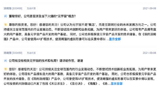 而汤姆猫股价真正起飞是搭上“元宇宙”。9月8日,汤姆猫在互动平台回复投资者关于元宇宙达的提问时表示,“元宇宙已不是概念,而是互联网行业发展方向之一。公司已经成立了相应的发行专项工作组,并协调国内外的研发团队,对特定产品立项与概念开发。”