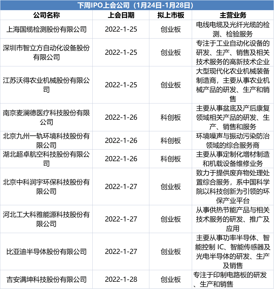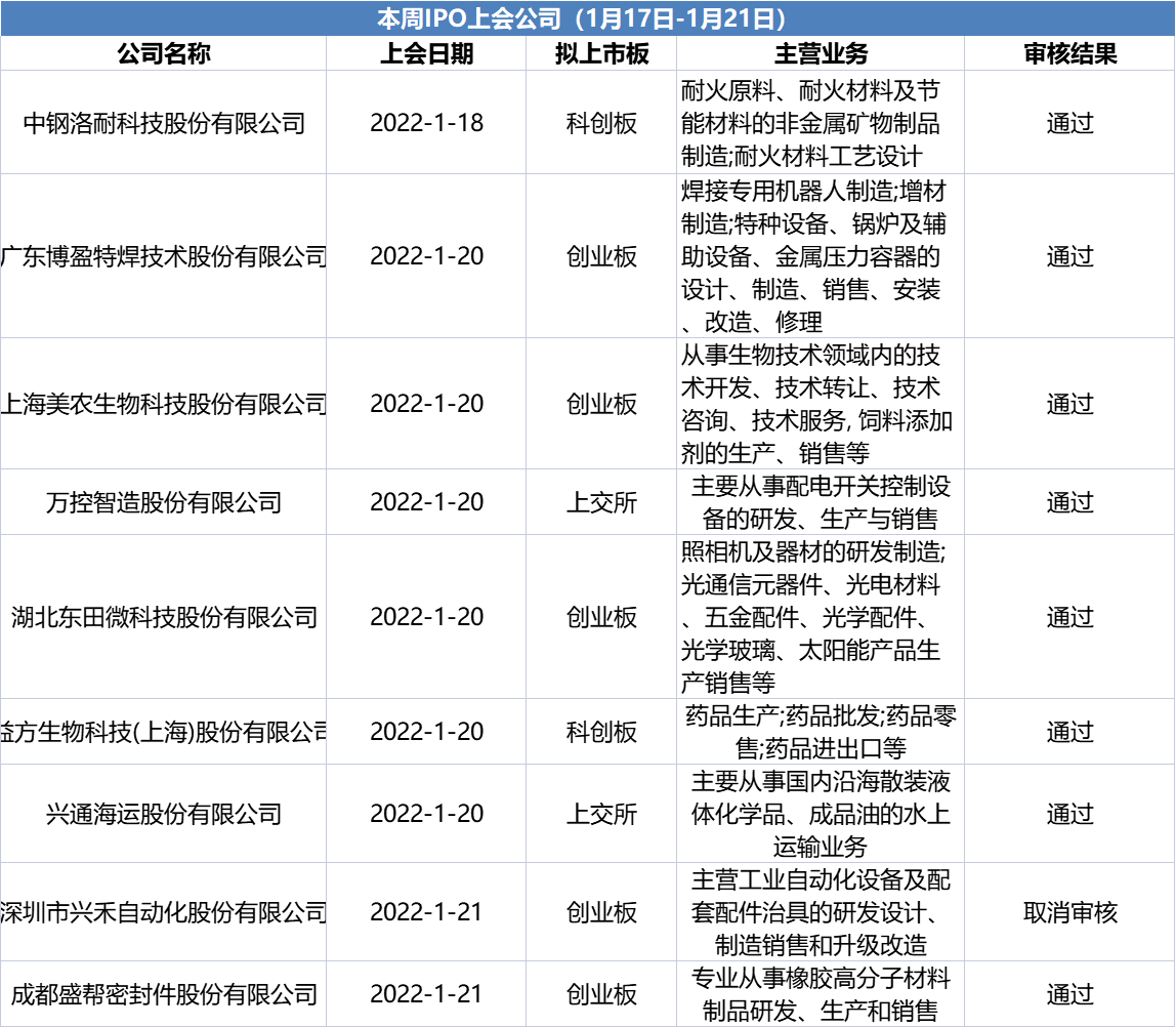 本周IPO上会公司共有9家,截至1月21日,8家公司审核通过,1家公司取消审核。