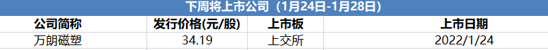 下周(1月24日)将有1家公司在上交所上市,股票简称为万朗磁塑,股票代码为603150,发行价格为34.19元。