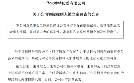1月24日,华宝股份收到耒阳市监察委员会立案通知书,其决定对公司实际控制人朱林瑶女士的违法问题立案调查。