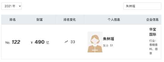 公开资料显示,朱林瑶白手起家,创下亿万资产。大学毕业后,朱林瑶在北京成立第一家香精香料贸易公司,后与丈夫联手成立了上海华宝公司,后发展成为华宝集团。根据《2021年胡润百富榜》,朱林瑶身家为490亿元,位列第122位,较往年上升33位。