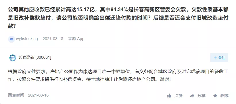 对此,长春高新曾在回复投资者留言时表示,根据政府文件要求,房地产公司作为康达项目唯一中标单位,有义务配合城区政府及时完成该项目的征收工作,按照文件要求提供征收补偿资金,待土地挂牌出让后返还房地产公司。