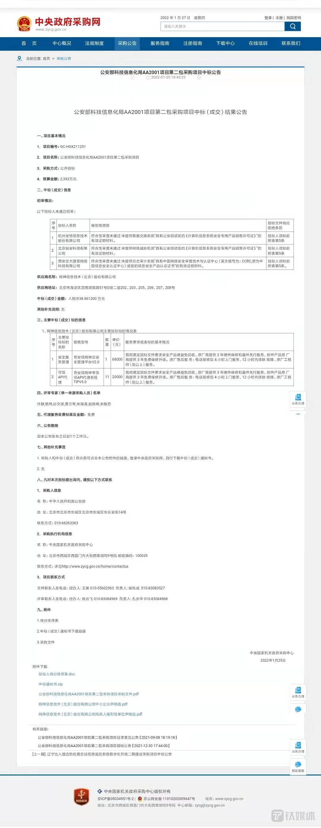 钛媒体App1月27日消息,根据中国政府采购网最新公告,奇安信38.9万低价中标了公安部某网络安全项目。据公告披露的信息,该项目预算金额为2393万元,实际中标金额约为38.9万元,明显远低于预算金额。公告信息显示,中标供应商为网神信息技术(北京)股份有限公司。工商数据显示,该公司系奇安信控股公司,奇安信持股比例99.9%。