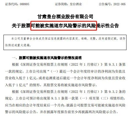 2020年底恢复上市,才过一年,命运多舛的皇台酒业(维权)又一次来到了退市边缘——2021年公司业绩或触碰退市的财务指标“红线”。