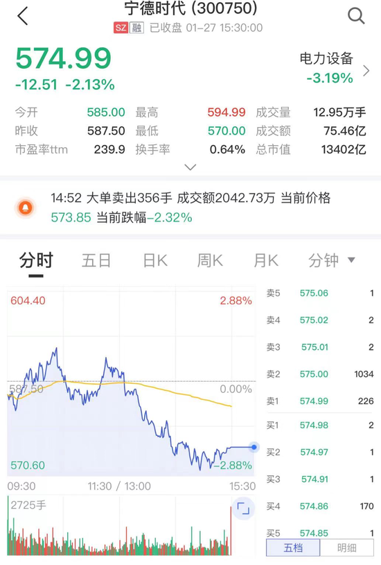 截至1月27日收盘,宁德时代报574.99元/股,市值13402亿元。