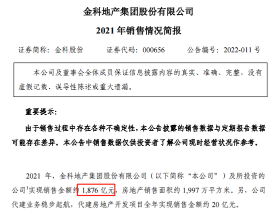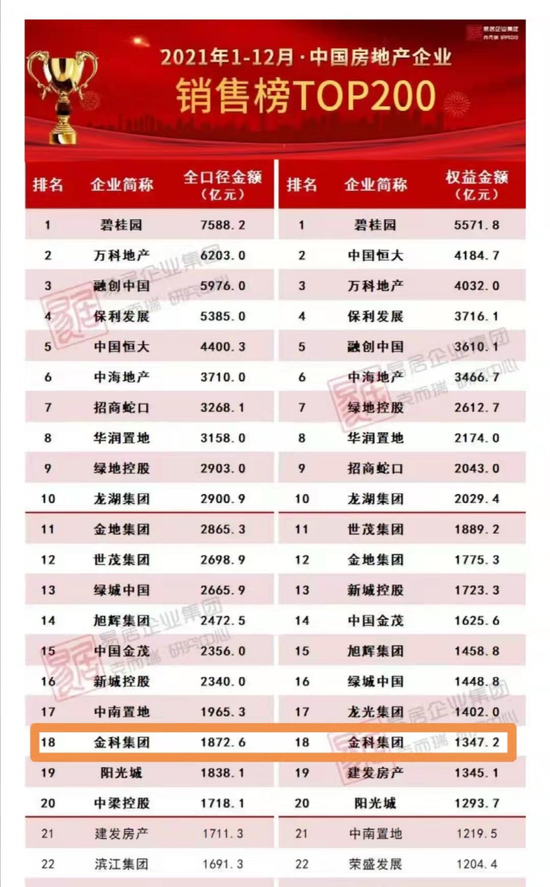 由于销售下滑,金科股份在全行业排名从2020年的第16为跌落到2021年的第18位。