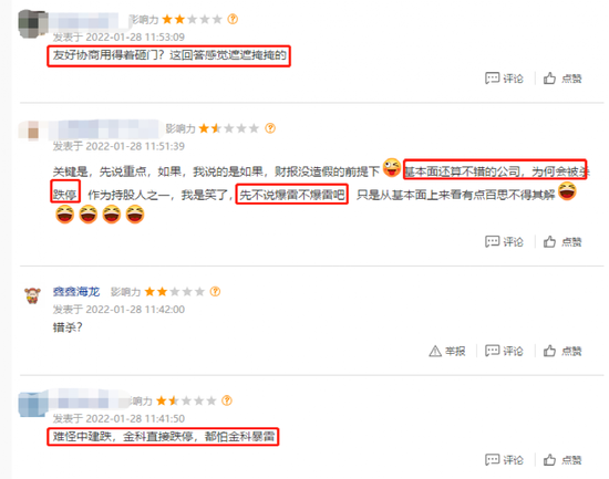 不过不少网友表示,“友好协商用得着砸门?这回答感觉遮遮掩掩的”“基本面还算不错的公司,为何会被杀跌停”“难怪中建跌,金科直接跌停,都怕金科暴雷”。