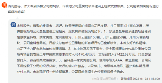 公司称,昨天所传播的视频公司已发现,并且高度关注事态发展,所传播视频与公司总包建设工程相关,现就具体情况说明如下:1、涉及总包单位承建的项目分别是蔡家金科城、蔡家美院、龙兴御临河、开州云玺台150亩、开州云玺台59亩、开州69亩新地块、云阳金科世界城,目前该总包单位已承建的所有项目均已全部竣备,本着友好合作精神,公司正全力配合总包单位办理结算。2、其中涉及农民工资金,经全面梳理该总包单位承接公司所有项目的农民工专户按政策要求应打入46170.43万元,实际已打入57422.63万元,均全部足额打入,符合相关政策要求。3、金科是一家优秀的公司,信用等级为AAA,截止目前,公司及下属控股子公司的银行贷款、发行的境内外债券、以及信托、商票等其他形式融资均按期足额兑付本息,未出现任何一例逾期情况。