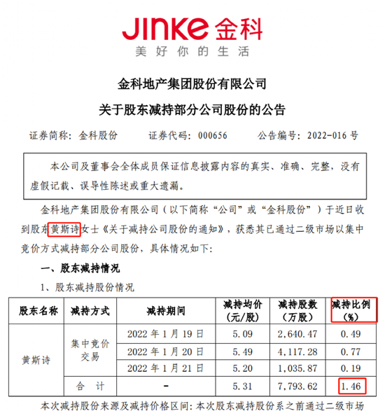 值得一提的是,就在双方宣布解除一致行动关系后一周,黄斯诗快速进行了减持。1月23日,金科股份公告,实控人黄红云女儿黄斯诗于前三个交易日减持金科7793.62万股,价格区间为4.96元/股—5.59元/股,减持均价为5.31元/股,合计套现4.14亿元,持股比例由2.31%下降至0.85%。