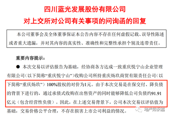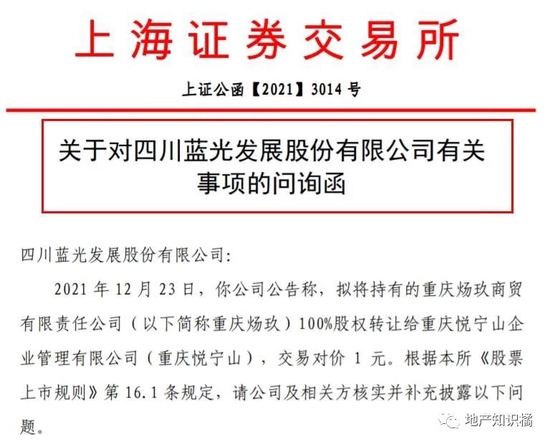 这场惨烈的“打骨折”交易把上交所都给惊动了,立马发了个问询函,要求蓝光发展说明交易作价仅为1元的原因,以及合理性。