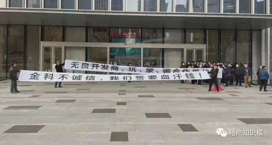 岁末年初,大批被拖款的供应商只能采取最原始的讨债方式,到金科总部楼下拉起横幅维权。