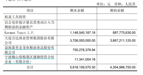 永辉超市持有金融资产以公允值计算,并非只有金龙鱼,还有Karman Topco(KT)、万达商管,以及康御投资,在2020年KT和万达商管都有增值,使得上述价值共计浮盈大约12.64亿元。