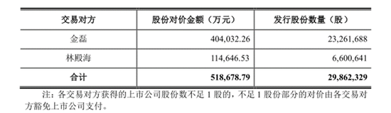 在对价支付上,双方选择通过发行股份及可转换债券的方式,其中发行股份支付对价51.87亿元。上述29.5%的少数股权由金磊与另一位自然人林殿海持有,两人据持股比例获得新发行的股份数额如下: