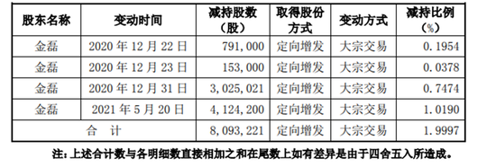 包含2021年5月20日这一次,金磊还于2020年12月22日、23日、31日共计做了4次减持,明细如下:
