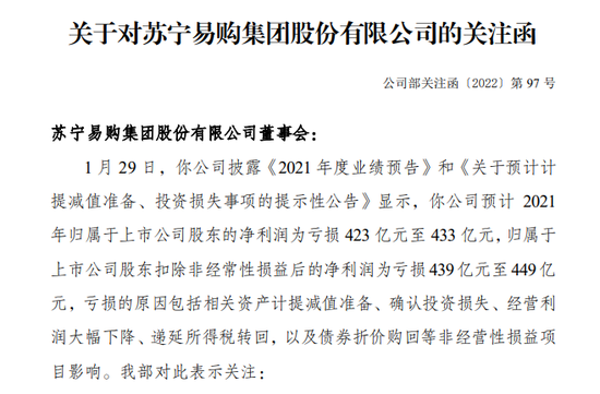 2021年巨亏的苏宁易购(002024),1月29日晚间收到深交所关注函。