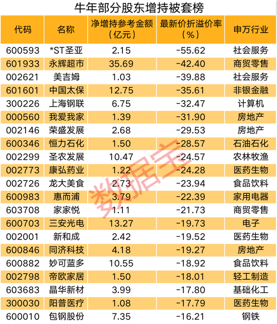 重要股东作为上市公司的“内部人士”,对公司经营等各方面情况相对更了解,体现对公司未来发展的信心。不过,市场行情往往充满不确定性,哪怕是大股东大举增持,也可能存在被套的情况。数据宝统计显示,按照最新价和股东净增持均价相比,牛年股东净增持逾亿元个股中,*ST圣亚、永辉超市、美吉姆、中国太保等个股折价逾30%。