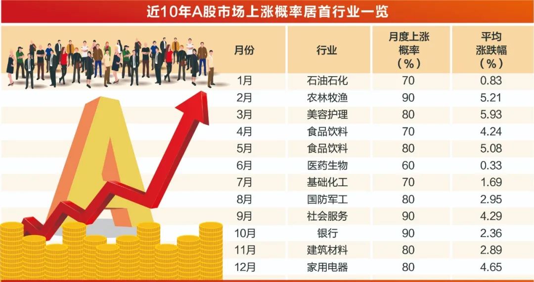 在1月、7月至12月这几个大盘上涨概率超50%的月份中,上涨概率居前的板块大多是建筑材料、家用电器、化工、食品饮料等顺周期板块。