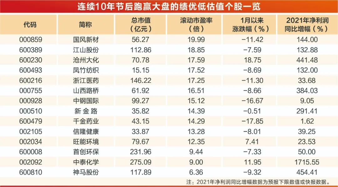 183只个股中,有14只个股2021年年报业绩绩优且估值较低。其中,近10年平均跑赢大盘9.13%的国风新材,预计2021年实现净利润2.8亿元,同比增长144%,滚动市盈率为19.99倍。首创环保、中泰化学、神马股份的滚动市盈率均不足10倍。
