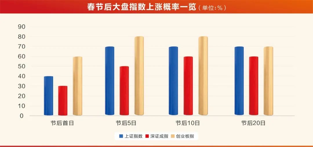 以深证成指来看,节后首日上涨概率仅为30%,后5日、后10日和后20日的上涨概率分别上升至50%、60%和60%。创业板指在节后的表现相对较好,节后首日上涨概率达到60%,后5日和后10日的上涨概率均达到80%。