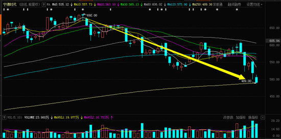 早间低开不到2分钟,宁德时代就遭到一笔超过1万手约合5.25亿元的大卖单下杀,股价快速下探至跌幅近5%,最低达到491元/股,午后则进一步下探,最低达到489元/股。截至收盘,宁德时代跌5.43%,报489.99元/股,正式考验重要的年线支撑。