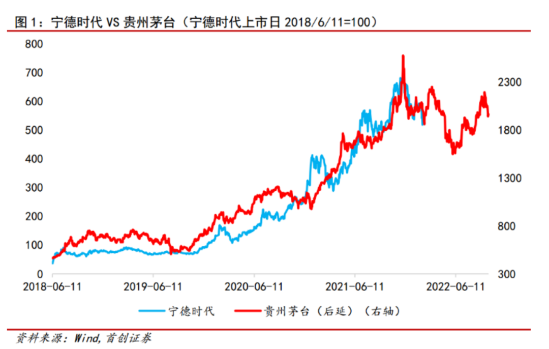 首创证券试图提供一个角度,来探讨宁德时代乃至新能源及高估值版块在短期的走势。他们认为,2021年贵州茅台的走势与2022年宁德时代的走势有较强的相似性。参考贵州茅台的走势,宁德时代短期可能并未见底,或还有20%的下跌空间,逢高出货是优选。
