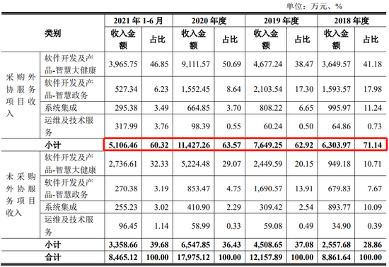 报告期各期,发行人采购外协服务的项目收入分别为6,303.97万元、7,649.25万元、11,427.26万元和5,106.46万元,占主营业务收入的比重分别为 1.14%、62.92%、63.57%和60.32%。