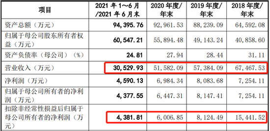 报告期内,发行人的营业收入为6.75亿元、5.74亿元、5.16亿元、3.05亿元,2019年、2020年增幅为-14.96%、-10.10%;扣非归母净利润为1.54亿元、0.81亿元、0.60亿元、0.44亿元,2019年、2020年增幅为-47.40%、-25.93%。