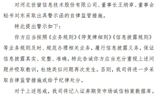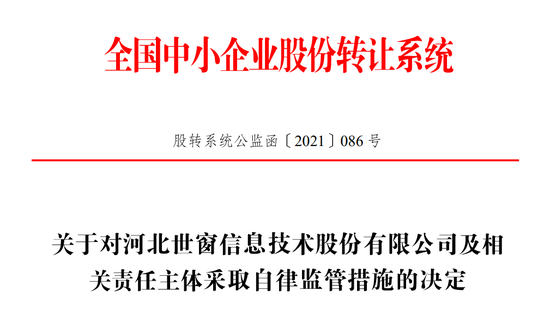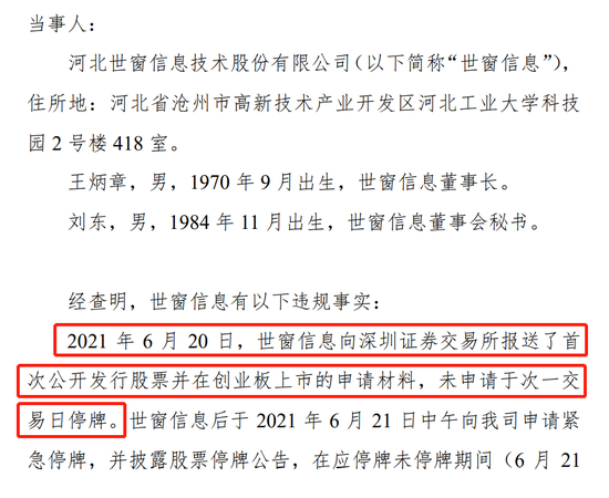 2021年7月20日,世窗信息因向交易所报送首次公开发行股票并在创业板上市的申请材料后,未申请于次一交易日停牌,全国股转公司对世窗信息、王炳章、刘东采取出具警示函的自律监管措施。