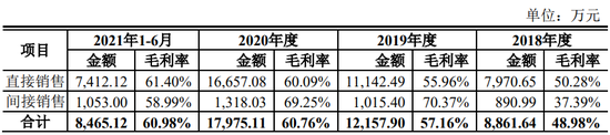 报告期各期,发行人的直接销售的毛利率分别为 50.28%、55.96%、60.09%和 61.40%,间接销售的毛利率分别为 37.39%、70.37%、69.25%和 58.99%,其中 2019 年和 2020 年的间接毛利率高于直接销售毛利率。