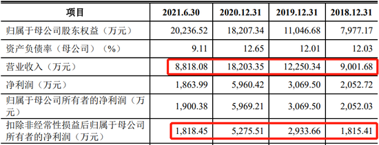报告期内,发行人的营业收入为0.90亿元、1.23亿元、1.82亿元、0.88亿元,2019年、2020年增幅为36.67%、47.97%;扣非归母净利润为0.18亿元、0.29亿元、0.53亿元、0.18亿元,2019年、2020年增幅为61.11%、82.76%。