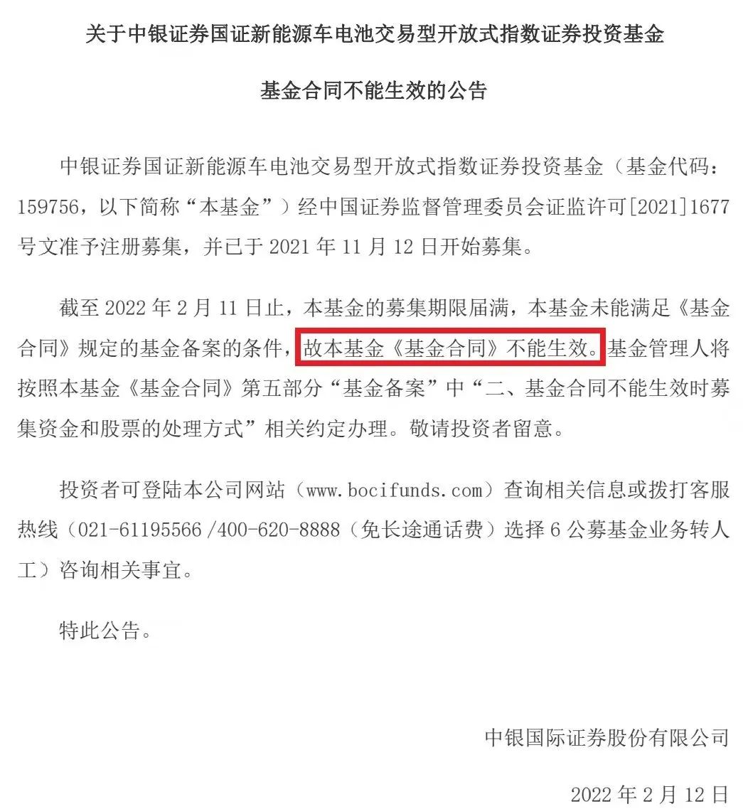 2月12日,中银国际证券发布关于中银证券国证新能源车电池交易型开放式指数证券投资基金合同不能生效的公告。