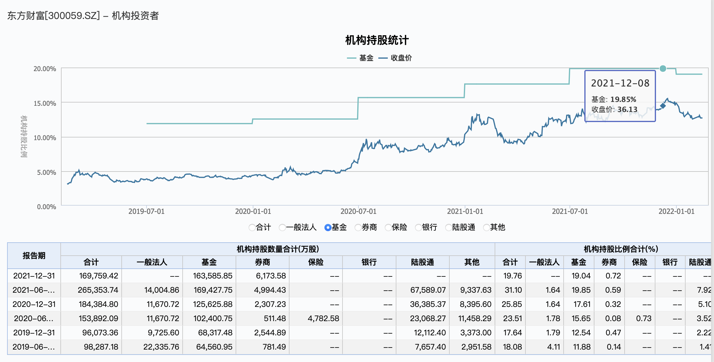 根据wind数据显示,2021年上半年,东方财富获机构“真金白银”支持,基金持股占比大增,从上年末的17.61%提升至19.85%。而在下半年,基金持仓比例略有下调。