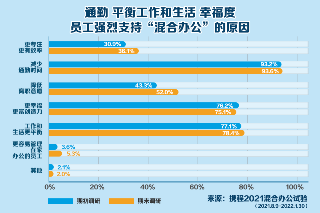在支持混合办公的员工调研中,携程总结出投票最高的3个理由:减少了通勤时间,时间利用更高效;便于平衡工作和生活;更幸福、更富创造力。