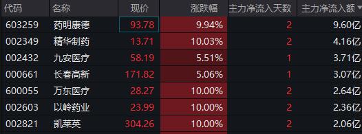 从资金流向来看,主力资金净流入医药板块超50亿元,其中,药明康德、精华制药、九安医疗分别获加仓9.6亿元、4.16亿元、3.71亿元。