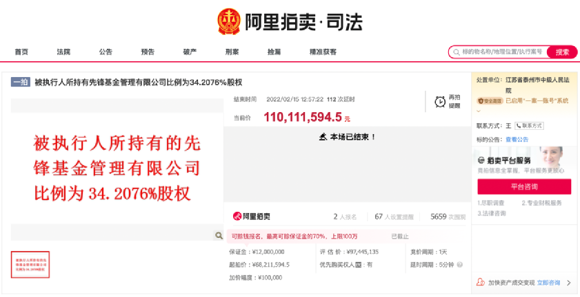 2月15日,阿里拍卖平台的拍卖信息显示,在江苏省泰州市中级人民法院于阿里拍卖平台开展的“被执行人所持有先锋基金管理有限公司比例为34.2076%股权”项目公开竞价中,朵元先生以最高应价胜出,成功竞得先锋基金约34.21%的股权,成为先锋基金的第一大股东。该标的网络拍卖成交价格为1.1亿元。