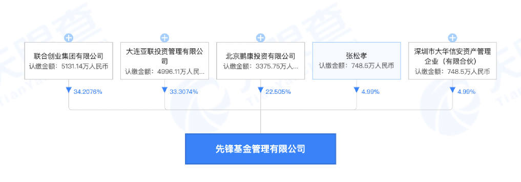 先锋基金现有股东为联合创业集团、大连亚联投资管理、北京鹏康投资、深圳市大华信安资产管理和张松孝等,其分别持股34.2076%、33.3074%、22.505%、4.99%和4.99%。