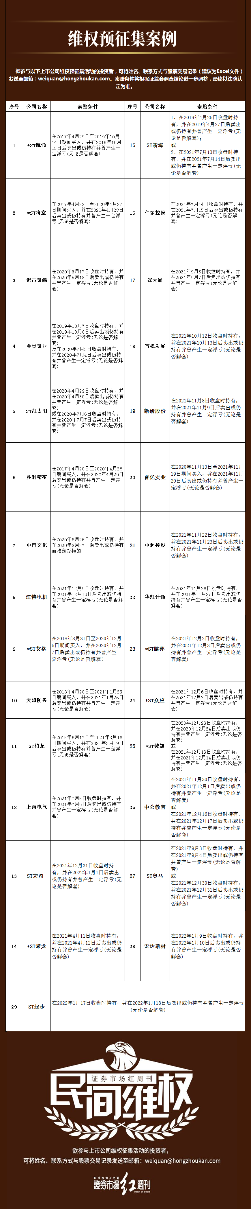 欲参与上市公司维权征集活动的投资者,可将姓名、联系方式与维权个股交易记录发送至邮箱: