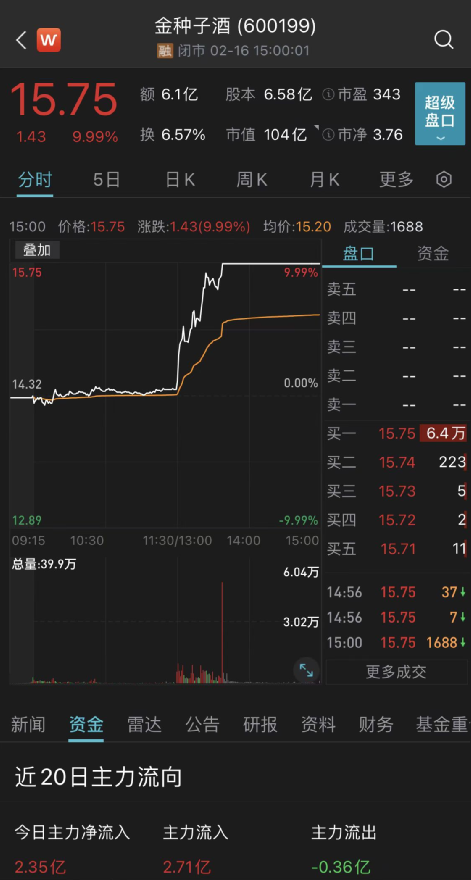 股价方面,2月16日午后开盘不久,金种子酒便封死涨停直至收盘,每股报15.75元,成交额6.06亿元,当日主力资金净流入2.35亿元。
