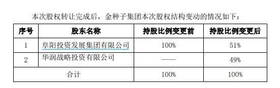 公告表示,为推动国有企业深化改革和高质量发展需要,公司控股股东金种子集团之唯一股东阜阳投资发展集团有限公司(以下简称“阜阳投发”)拟按照《企业国有资产交易监督管理办法》(国资委、财政部令第 32 号,以下简称“32 号令”)等法律法规以非公开协议转让方式将所持金种子集团49%的股权转让给华润(集团)有限公司之全资附属企业华润战略投资有限公司(以下简称“华润战投”)。阜阳投发与华润战投于 2022 年 2 月 16 日签署了《关于安徽金种子集团有限公司之股权转让协议》。本次交易后,控股股东引入重要战略股东,双方进行长期合资合作。
