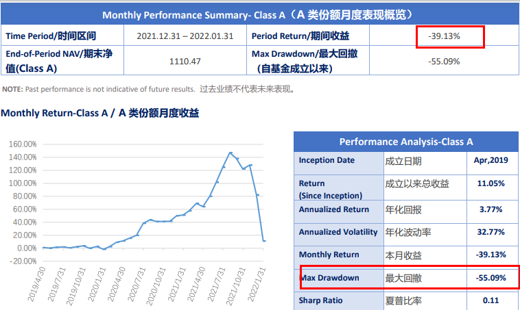 但此后半年内,该产品经历了巨幅回撤。回撤最差的今年1月份,该产品直接下跌了39%以上。