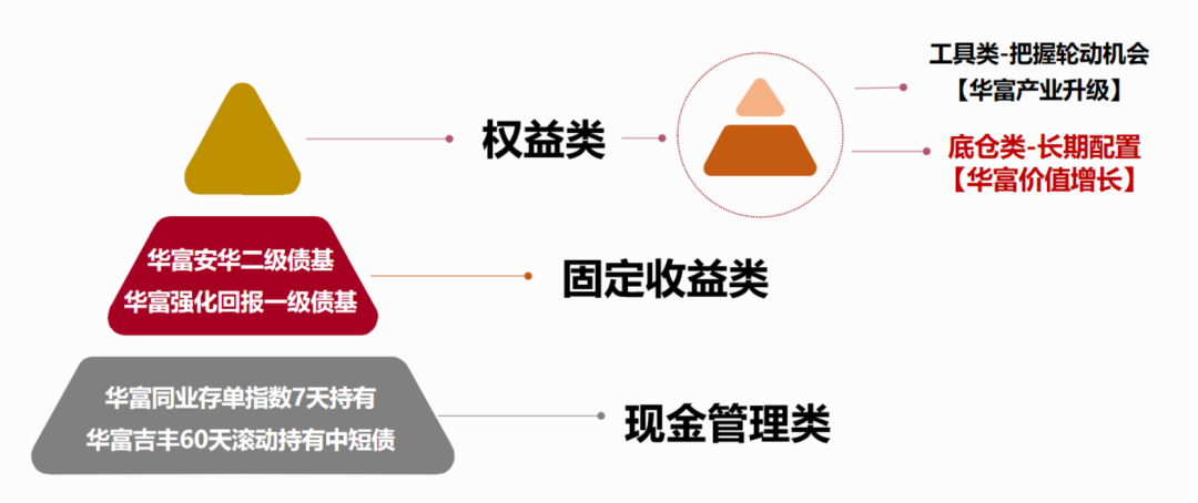 “双金字塔”均衡配置法,顾名思义,还有一个金字塔的配置结构,指的是在权益类资产中也要注重对于均衡型基金的配置。可以选择一些均衡布局、行业配置适度分散,不追逐行业热点,投资风格不漂移的“底仓型基金”长期持有,构建权益投资的基本盘,比如华富价值增长(410007)。同时也可以配置一些自己看好的主题赛道型基金,把握市场的轮动机会,比如跟随中国未来产业发展趋势、聚焦“专精特新”框架下制造业隐形龙头的华富产业升级(002064)。两相结合,做好仓位管理,等待市场回暖,力争把握中长期上涨的机会。