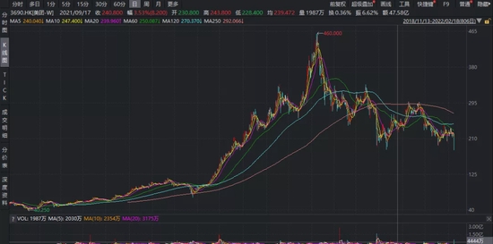 2月18日14:30分许,港股美团-W突然急速下跌,一度下跌超17%。截至当日收盘,美团-W跌14.86%,报188港元,最新市值1.15万亿港元,当日市值挥发近2000亿港元。