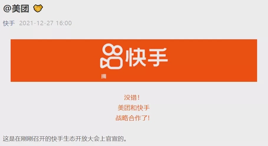 值得注意的是,均在港股尾盘大跌的美团、快手,在2021年12月27日达成互联互通战略合作。