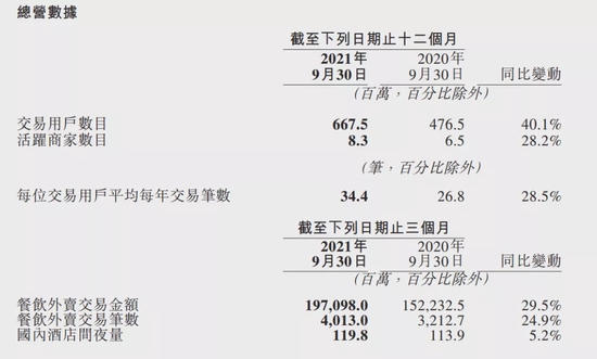 从用户角度来看,美团2021年第三季度交易用户数为6.675亿,而2020年同期为4.765亿,同比增长40.1%;活跃商家数目830万户,2020年同期为650万户,同比增长28.2%;每位交易用户平均每年交易34.4笔,2020年同期26.8笔,同比增长28.5%;餐饮外卖交易金额1970.98亿元人民币,2020年同期为1522.325亿元人民币,同比增长29.5%。