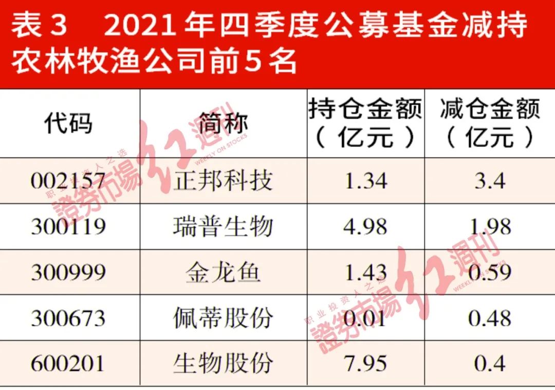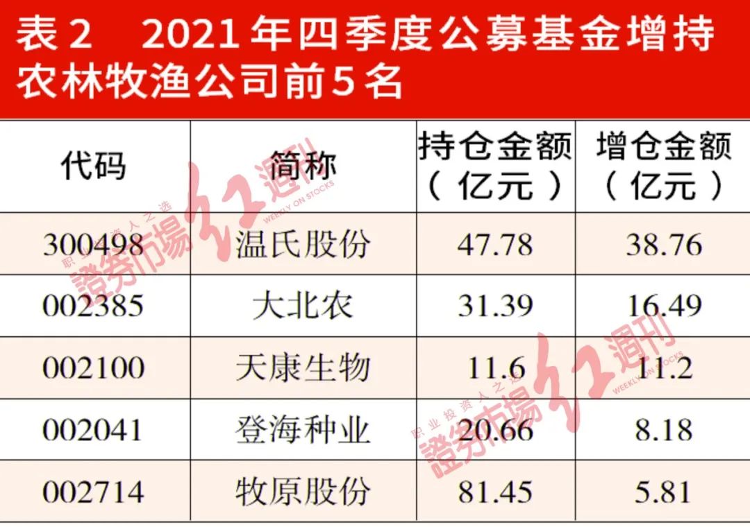 就春节前刚刚披露的公募基金2021年四季报来看,2021年四季度末,农林牧渔板块基金重仓持股市值占基金股票投资市值比为1.26%,环比提升了0.25%,在基金持仓的申万一级子行业中排名第17位,比三季度末上升一位。