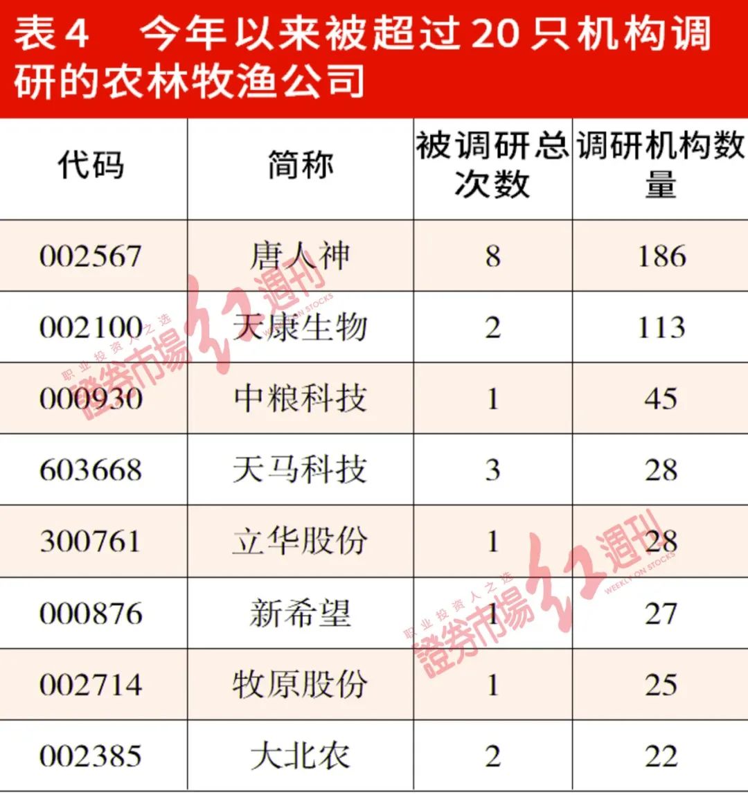 另外,从今年以来的最新调研数据可以看到,不少农林牧渔板块公司也迎来了机构的密集调研,唐人神、京基智农(维权)、天马科技、大北农等8家公司都被调研了两次以上。从参与调研的机构数量统计,唐人神的被关注度最高,共有186只机构对其调研8次,其中睿远基金、宝盈基金、富国基金、重阳投资、景林资产等公私募基金均在其中。天康生物紧随其后,年内也已分两批接待了113只机构的调研,参与调研机构包括易方达基金、嘉实基金、华泰柏瑞基金、星石投资等。