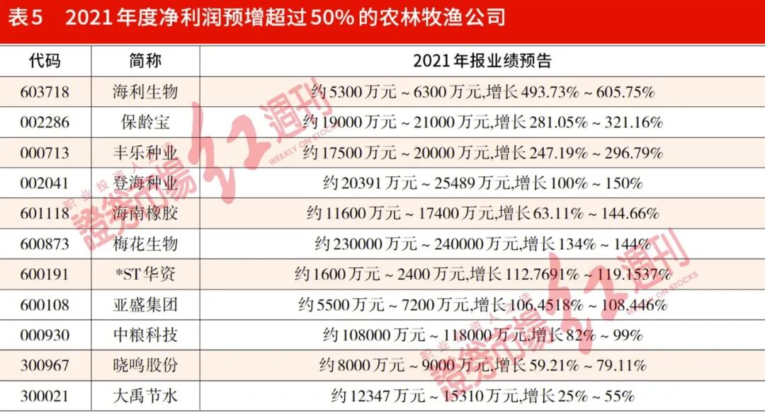另外,农产品加工股梅花生物(维权)、中粮科技的年报业绩增长预期也十分乐观。其中梅花生物预计实现134%~144%的净利润同比增速,原因源于经营性利润增长。中粮集团则凭借公司继续保持原料多样化采购模式,进一步降低原料成本,同时产品价格较去年同期有所上涨,使得产品毛利率也实现了增加,预计全年净利润为10.8亿元~11.8亿元,同比预增82%~99%。