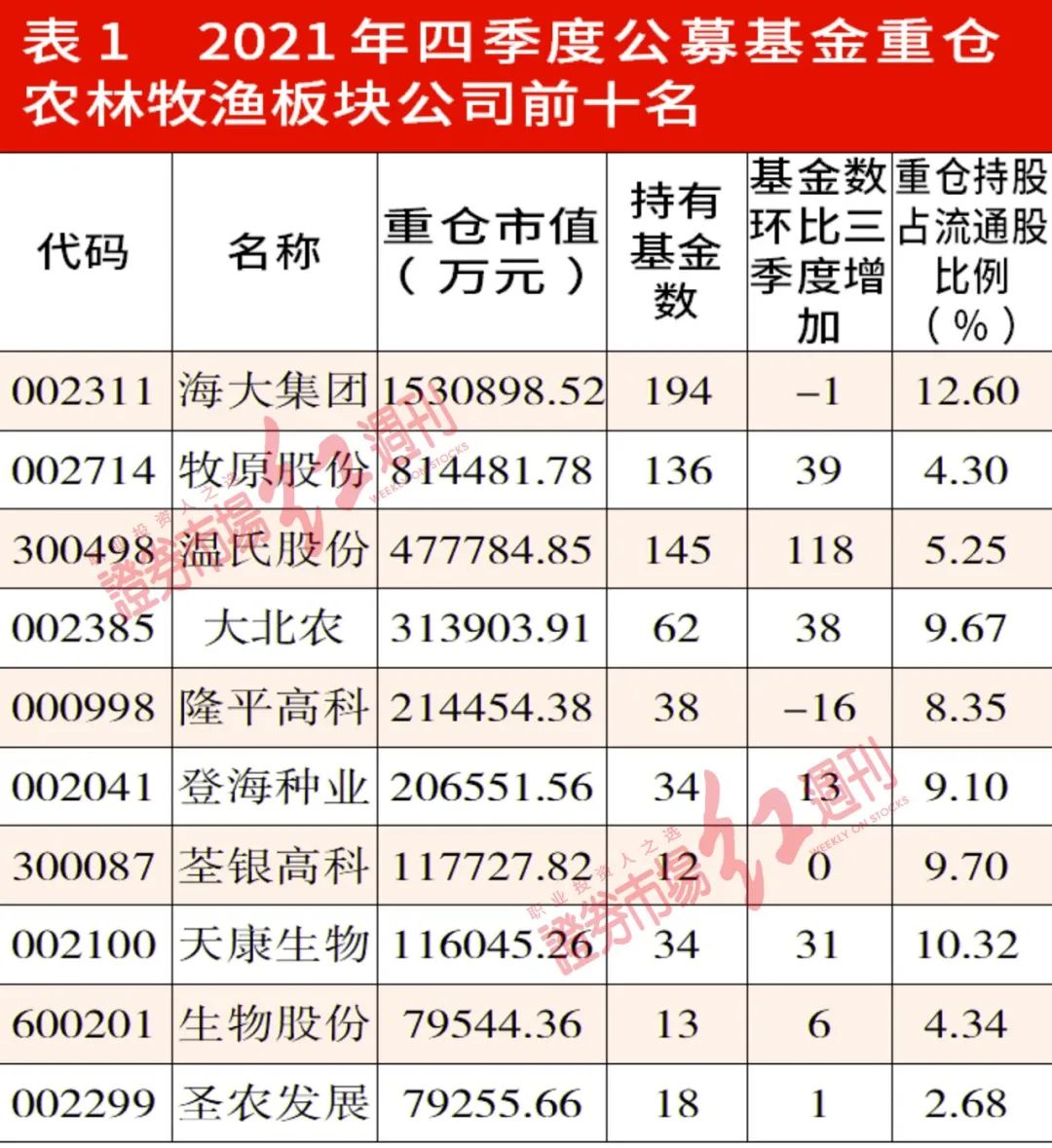 对于农林牧渔板块个股,公募基金2021四季度重仓持股前十名的个股分别为海大集团、牧原股份、温氏股份、大北农、隆平高科、登海种业、荃银高科、天康生物、生物股份、圣农发展。其中饲料白马龙头海大集团及生猪养殖龙头牧原股份重仓的市值合计达234.54亿元,占农林牧渔前十大基金重仓股持仓市值的59.37%。